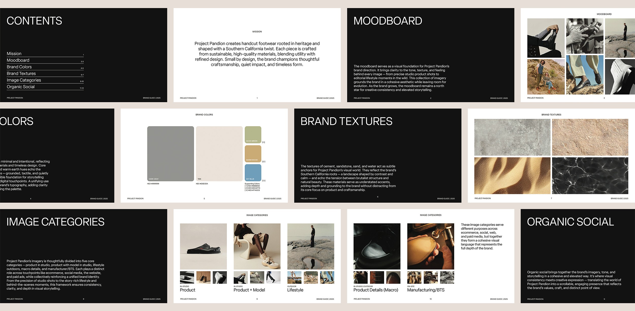 I was approached to bring a new sustainable, handcrafted footwear brand to life visually. With little to no existing imagery, I developed a full brand guide and executed photography that defined Project Pandion's brand world, highlighting craftsmanship, quality, and intentional design.